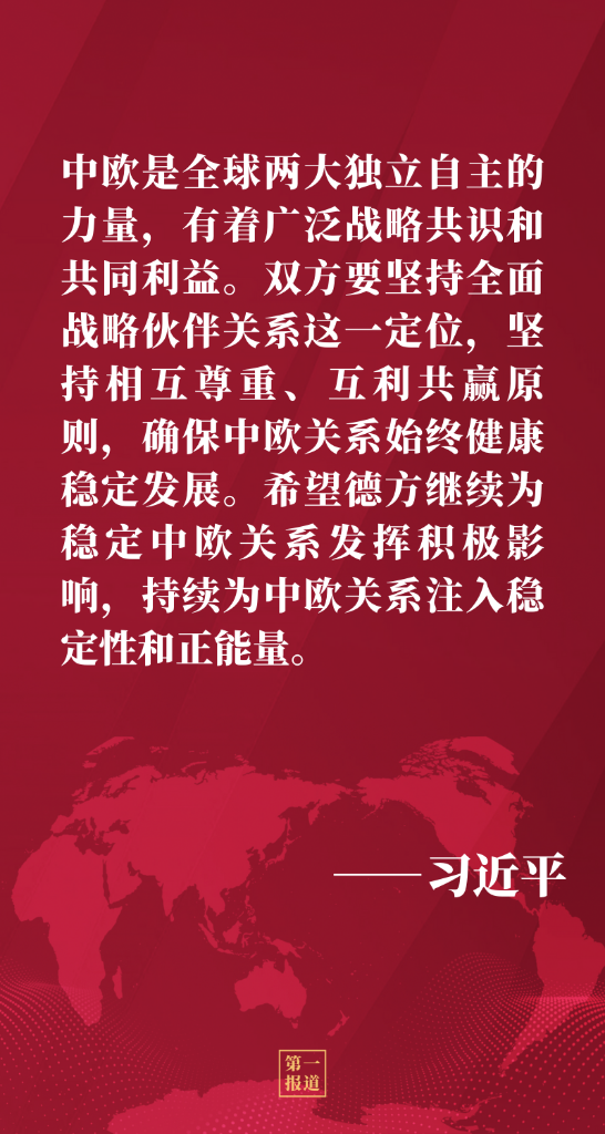 習(xí)近平強調(diào),中歐是全球兩大獨立自主的力量,有著廣泛戰(zhàn)略共識和共同利益。雙方要堅持全面戰(zhàn)略伙伴關(guān)系這一定位,堅持相互尊重、互利共贏原則,確保中歐關(guān)系始終健康穩(wěn)定發(fā)展。希望德方繼續(xù)為穩(wěn)定中歐關(guān)系發(fā)揮積極影響,持續(xù)為中歐關(guān)系注入穩(wěn)定性和正能量。