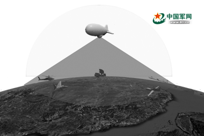 上圖為氣球平臺(tái)偵察監(jiān)視示意圖。