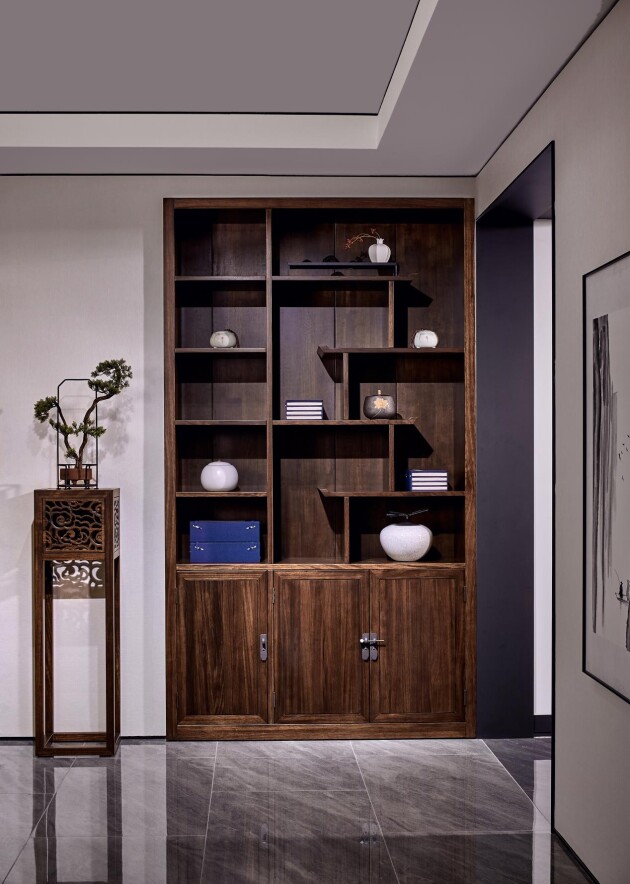 博古之意即為“通曉古事古物”,在典雅莊重、精致奇妙的中式家具系列里,博古架屬于中式設(shè)計(jì)書房,客廳中可陳設(shè)古玩瓷器等珍寶的一類家具,既有實(shí)用功能,又突顯中式空間的裝飾美學(xué)。書檀設(shè)計(jì)師在深入理解宋式家具的造型、裝飾、意境的人文內(nèi)涵基礎(chǔ)之上,融合現(xiàn)代極簡(jiǎn)設(shè)計(jì)風(fēng)格,既具中國(guó)傳統(tǒng)家具的意境,又不失時(shí)尚感。曲直之間,盡顯中式文化的韻律。