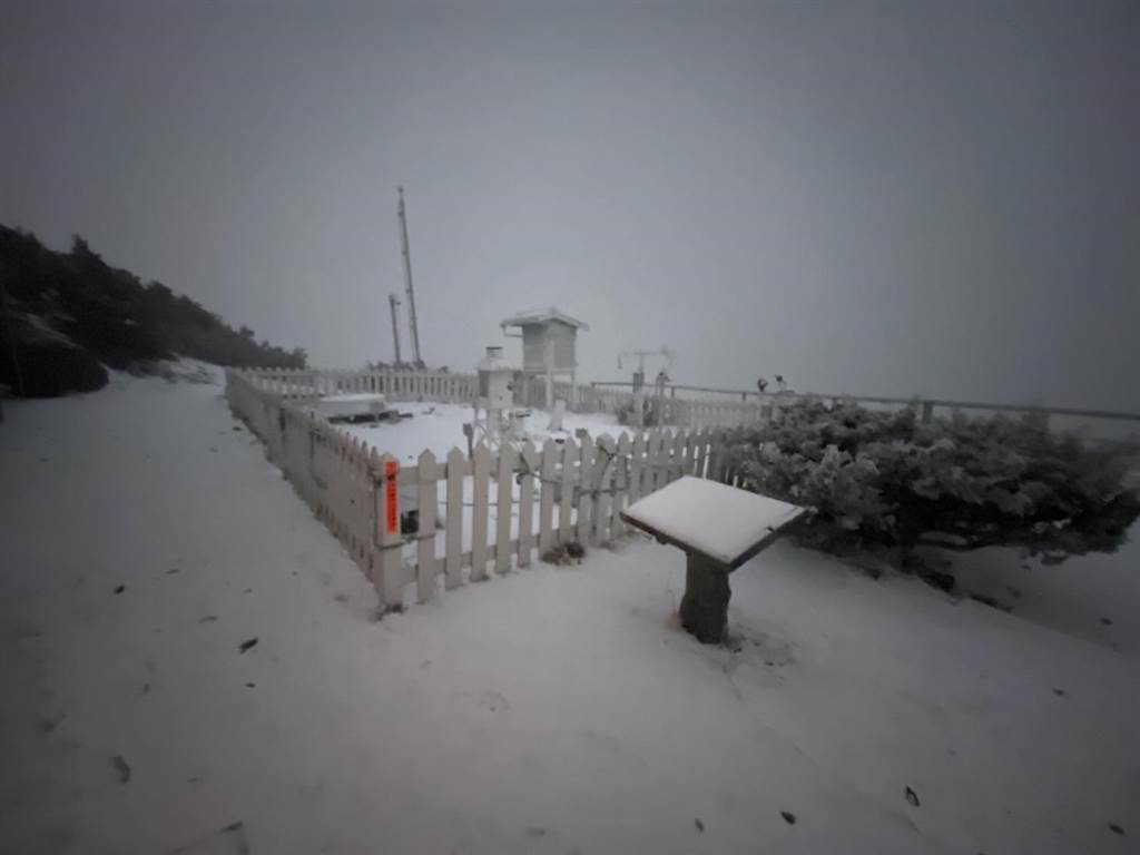 玉山今天凌晨降雪,積雪達0.5公分。(玉山氣象站提供)