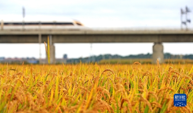 9月22日,在遼寧省鐵嶺縣腰堡鎮(zhèn),高鐵列車從金色的稻田旁經(jīng)過(guò)。新華社記者 楊青 攝