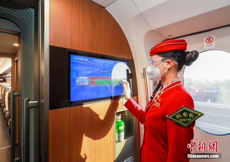12月27日,從北京西開(kāi)往雄安的C2703次智能復(fù)興號(hào)動(dòng)車(chē)組內(nèi),列車(chē)長(zhǎng)查看旅服交互系統(tǒng)。中新社記者 賈天勇 攝
