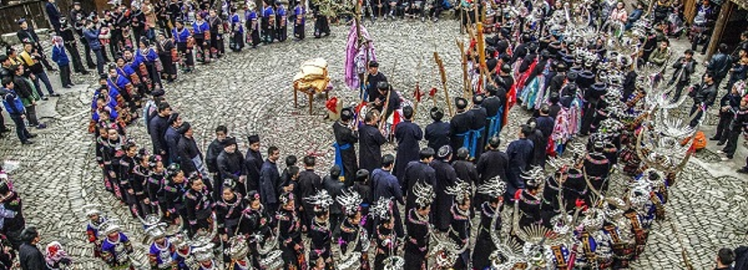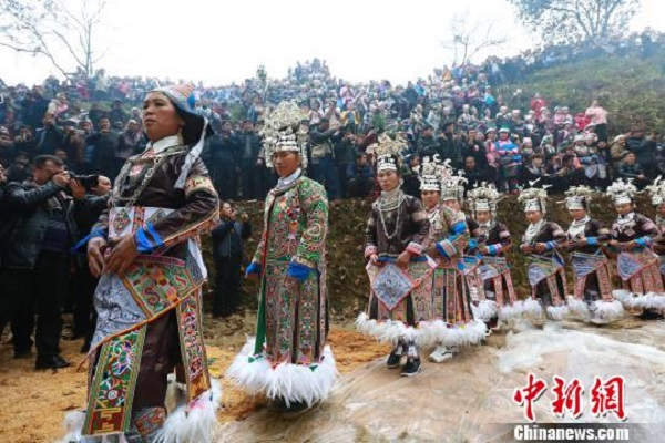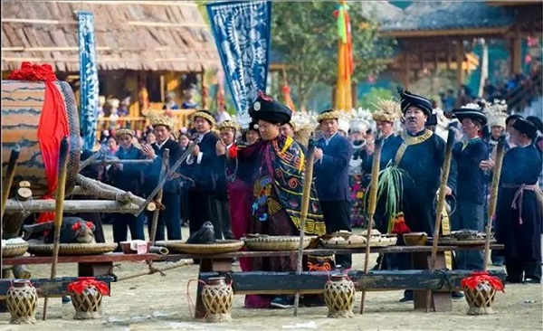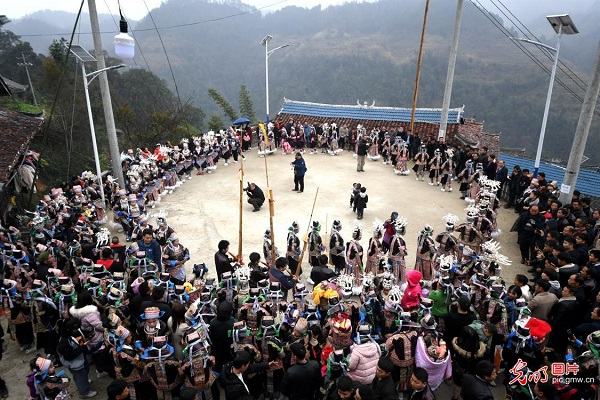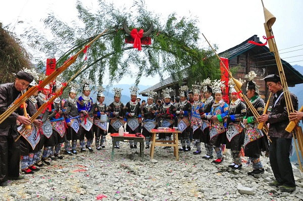 第三年的四月吉日,舉辦“審?!眱x式,唱《贊牛歌》,并用芭茅草掃遍牛的全身,表示已將附在牛身上的邪氣驅(qū)除。同年九月丑日,舉行獻(xiàn)牲、祭鼓儀式,將每頭已按習(xí)俗打扮過的祭祖牯牛宰殺用于祭祖。節(jié)日共計14天,最后一天全體寨民集中到鼓廟舉行祭鼓儀式。