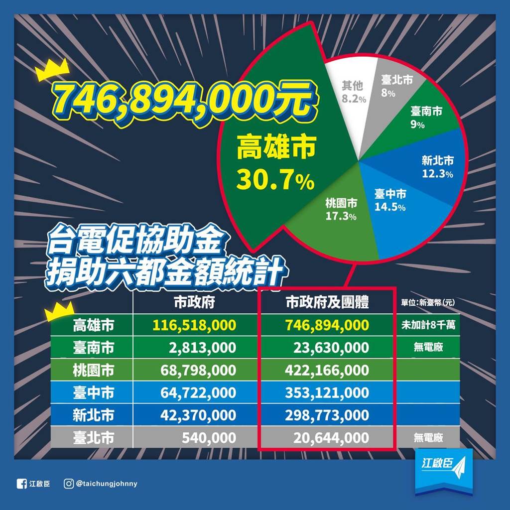江啟臣29日在臉書發(fā)文,指出臺(tái)電今年編列“捐助‘政府’機(jī)關(guān)”的促協(xié)金共19億4673萬(wàn)7千元,還有捐助給其他團(tuán)體的促協(xié)金約4億8535萬(wàn)4千元,總計(jì)高達(dá)24億3209萬(wàn)1千元。江啟臣表示,在這之中有7億4689萬(wàn)4千元是捐給高雄市政府及高雄的人民團(tuán)體,占總額的30.7%,反觀臺(tái)中只有收到3億5312萬(wàn)1千元的捐助,高雄的金額是臺(tái)中的2.12倍;新北也僅有2億9877萬(wàn)3千元,高雄則是新北的2.5倍。