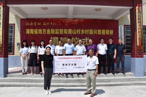會后還舉行了慈善幫扶捐贈儀式。在調(diào)研組一行、洞口縣縣委常務(wù)、常務(wù)副縣長楊云龍、石柱鎮(zhèn)黨委書記王正偉等的見證下,平安普惠湖南分公司向青山村捐贈現(xiàn)金10萬元。支村兩委決定將善款將匯入青山村慈善幫扶基金,主要用于村民救助、獎勵以及與村民利益密切相關(guān)的公益性事業(yè)建設(shè)。