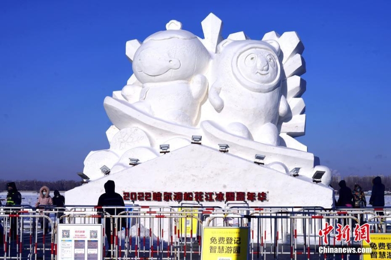 2022年1月2日,黑龍江哈爾濱,“冰墩墩”和“雪容融”雪雕吸引游客。近日,以北京冬奧會(huì)為主題的冰雕、雪雕亮相哈爾濱中央大街和防洪紀(jì)念塔廣場(chǎng)。 中新社發(fā) 孫漢侖 攝