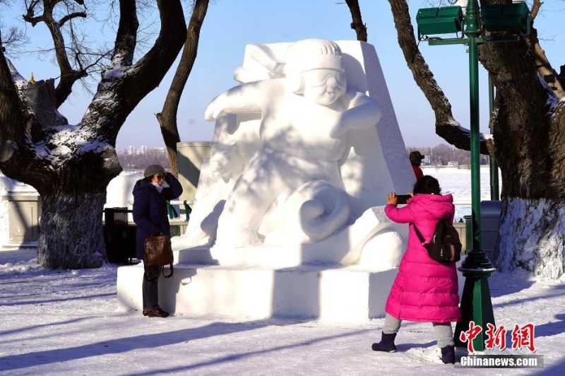 2022年1月2日,哈爾濱,游客與“滑雪運(yùn)動(dòng)員”雪雕合影留念。 中新社發(fā) 孫漢侖 攝