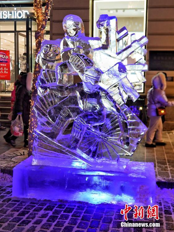 2022年1月2日,哈爾濱中央大街,以冬奧為主題的冰雕在燈光下流光溢彩。 中新社發(fā) 孫漢侖 攝