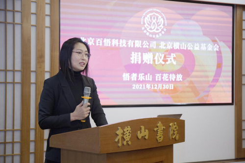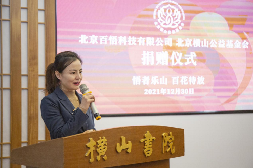2021年12月30日,北京百悟科技有限公司(簡稱“百悟科技”)向北京橫山公益基金會捐贈文化公益事業(yè)善款人民幣100萬元,助力傳統(tǒng)國學文化創(chuàng)新發(fā)展。百悟科技輪值總裁白慧女士,百悟科技戰(zhàn)略市場部經(jīng)理劉昱成,北京橫山公益基金會秘書長、北京橫山書院執(zhí)行院長韓淑賢女士,北京橫山公益基金會相關負責人出席本次捐贈儀式。