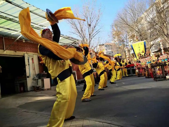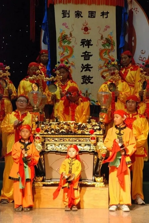 劉園祥音法鼓出現(xiàn)于清代道光年間,它原在寺院娘娘出巡時(shí)以隨駕法鼓會(huì)的形式表演,主要流行于天津市北辰區(qū)內(nèi)。劉園祥音法鼓出會(huì)時(shí),前面是前彩和樂(lè)隊(duì)兩部分組成的儀仗隊(duì),由引鑼指揮。前彩是娘娘出巡時(shí)警示人們回避和隨身攜帶起居用品的編隊(duì),主要包括大門(mén)旗、高照、軟對(duì)、硬對(duì)、燈牌、圓籠、八角盒、衣箱、茶桶、茶炊、風(fēng)燈等儀仗和起居用品及鼓、鈸、鐃、镲、鐺鋃、大圖、九蓮燈等樂(lè)隊(duì)器具。
