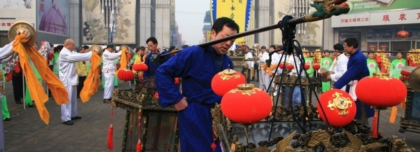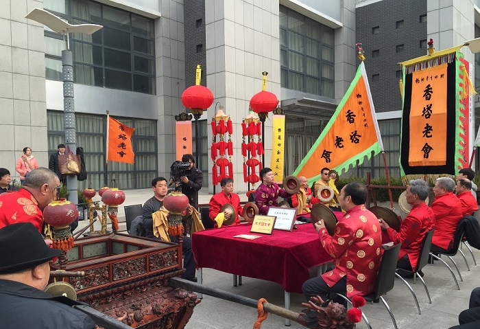 津門(mén)法鼓是天津市的一種地方傳統(tǒng)音樂(lè)舞蹈藝術(shù),以老會(huì)或圣會(huì)的表演形式出現(xiàn)。據(jù)傳,最早的一個(gè)法鼓團(tuán)體即是大覺(jué)庵金音法鼓會(huì)。法鼓會(huì)樂(lè)器由鼓、鈸、鐃、鉻子、鐺子等組成,而以鼓為主,居于樂(lè)隊(duì)的中央;鈸左鈸右,各有七八人;鉻子、鐺子各二人,都在鼓后。津門(mén)法鼓是天津市的一種地方傳統(tǒng)音樂(lè)舞蹈藝術(shù),以老會(huì)或圣會(huì)的表演形式出現(xiàn)。據(jù)傳,最早的一個(gè)法鼓團(tuán)體即是大覺(jué)庵金音法鼓會(huì)。法鼓會(huì)樂(lè)器由鼓、鈸、鐃、鉻子、鐺子等組成,而以鼓為主,居于樂(lè)隊(duì)的中央;鈸左鈸右,各有七八人;鉻子、鐺子各二人,都在鼓后。