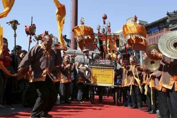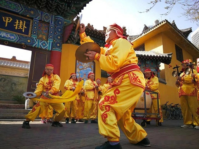 掛甲寺慶音法鼓鑾駕老會(huì)成立于1731年(清雍正九年),明代崇禎皇帝后妃曾賜掛甲寺半副鑾駕,掛甲寺僧人憑借鑾駕成立了掛甲寺慶音法鼓鑾駕老會(huì),至今已有三百多年的歷史。掛甲寺慶音法鼓主要流傳于天津市河西區(qū)掛甲寺街及其周邊地區(qū),它是一種極具特點(diǎn)的民間音樂(lè)形式,表演中既有精美的道具,又有高超的技巧和優(yōu)美的舞蹈動(dòng)作。