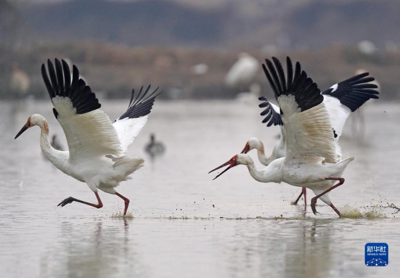 白鶴在濕地追逐嬉戲(1月1日攝)。新華社記者 萬象 攝
