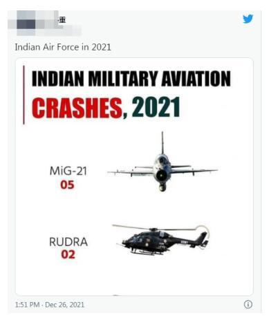 報道稱,中國社交媒體用戶在推文中分享了一張圖表,突顯印度空軍在2021年墜毀的飛機數量。在過去一些年,多個中國推特賬號一直在“破壞和誹謗”印度軍隊。此外,巴基斯坦也在試圖抹黑印度空軍的形象。