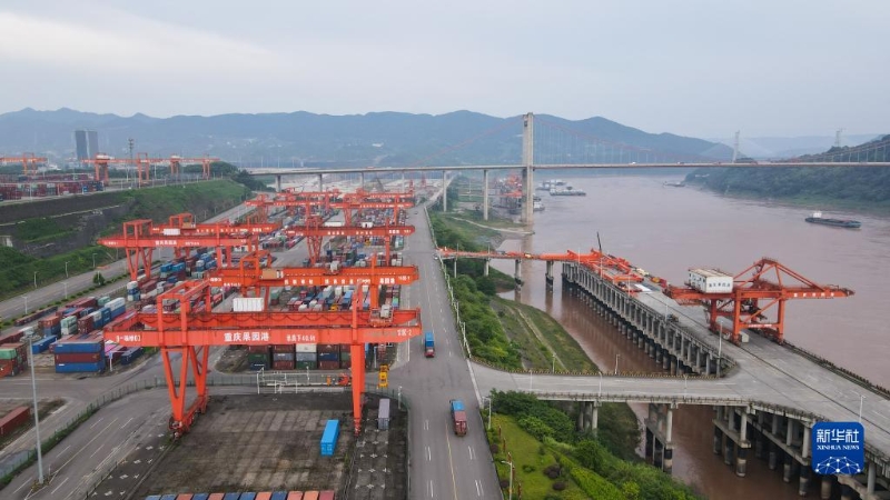 上游,重慶兩江新區(qū)果園港,塔吊林立,貨輪穿梭,鐵軌交錯(cuò),車流滾滾。