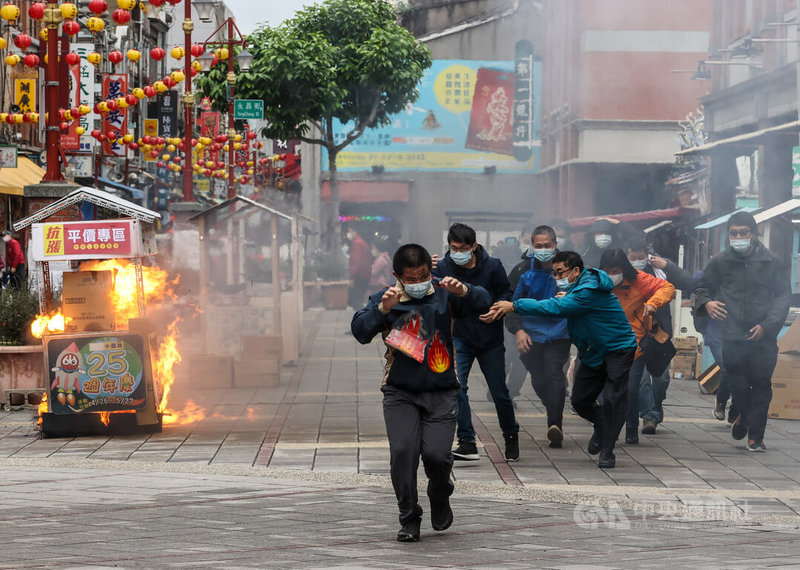 臺(tái)北年貨大街15日登場(chǎng),臺(tái)北市消防局今天在迪化年貨大街舉辦消防演習(xí)活動(dòng),盼可強(qiáng)化迪化街及永樂市場(chǎng)攤商、店家防災(zāi)觀念與應(yīng)變能力,確保民眾年關(guān)采購安全。
