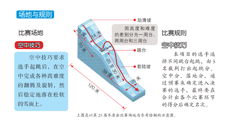 場地由助滑坡、過渡區(qū)、平臺區(qū)、跳臺、著陸坡和停止區(qū)組成。比賽極易受天氣影響,場地專門設(shè)有三個(gè)風(fēng)向標(biāo)。