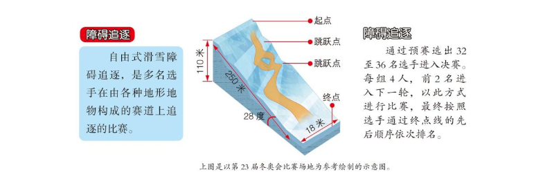 自由式滑雪項(xiàng)目包括空中技巧、雪上技巧、U型場地技巧、坡面障礙技巧、障礙追逐和大跳臺(tái)等小項(xiàng),不同小項(xiàng)各具特色。