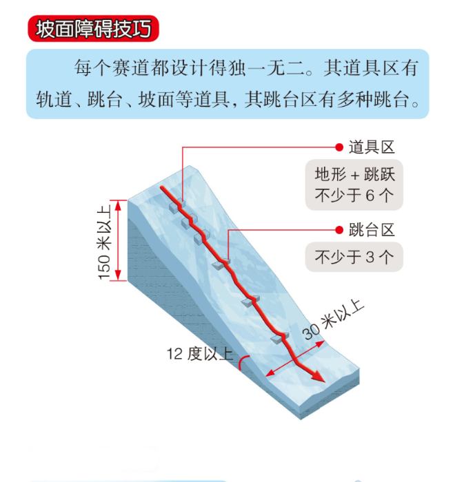 坡面障礙技巧場地由一系列障礙、跳臺、桿、平臺等構(gòu)成,場地賽道落差最少為150米,平均坡度在12度以上。