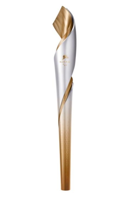 北京冬殘奧會的火炬為金色與銀色,寓意輝煌與夢想。金色線條隨火炬轉動而上下貫通,象征著激情的冰雪賽道,也代表著永恒的火種,光明向上,表達了人類生生不息、包容融合、向往和平的期望和“勇氣、決心、激勵、平等”的殘奧價值觀。