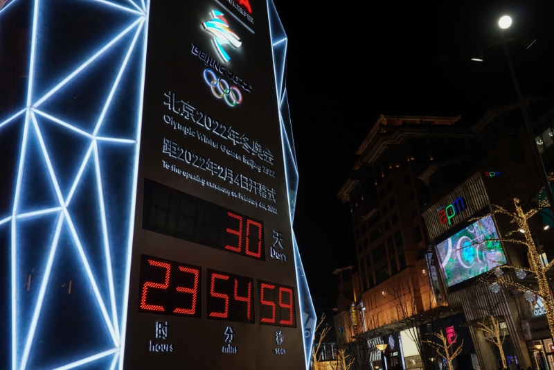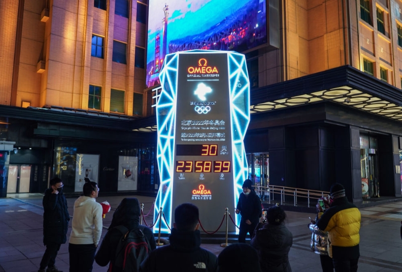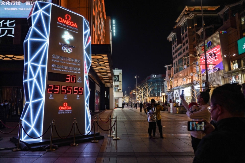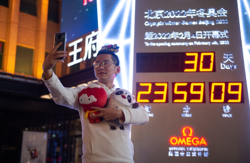 1月4日,北京2022年冬奧會迎來開幕倒計時一個月。人們紛紛在北京王府井大街的北京2022年冬奧會倒計時牌前拍照留念。(攝影 陳鐘昊)