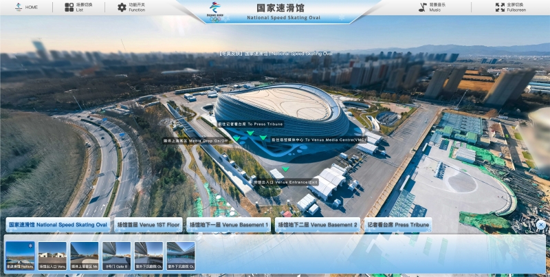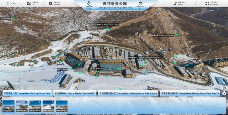 該系統(tǒng)以全景、全維的融媒體技術(shù)形式,通過高空航拍視角和720度地面全景視角,全方位、立體式的展現(xiàn)了北京、延慶和張家口三個(gè)賽區(qū)12個(gè)北京冬奧會(huì)競(jìng)賽場(chǎng)館和3個(gè)冬奧村場(chǎng)館的媒體中心,對(duì)場(chǎng)館媒體運(yùn)行功能區(qū)、媒體流線、場(chǎng)館運(yùn)行情況等進(jìn)行了可視化的體現(xiàn)。作為科技冬奧的組成部分,該系統(tǒng)首次探索實(shí)現(xiàn)了將全景、全維的融媒技術(shù)運(yùn)用于奧運(yùn)會(huì)場(chǎng)館的可視化,旨在全面、形象的展示北京2022年冬奧會(huì)各競(jìng)賽場(chǎng)館和部分非競(jìng)賽場(chǎng)館的賽前狀況,向國(guó)際社會(huì)和全球媒體提供高效、便捷的信息服務(wù),傳遞北京籌辦工作的進(jìn)展。