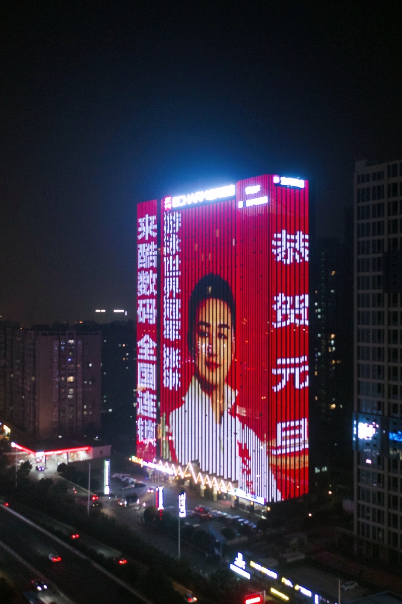 2022年元月1日來酷在重慶、長沙驚艷亮相,當(dāng)天晚上來酷正式啟動(dòng)“閃耀行動(dòng)”廣告全國同步鋪開,重慶、長沙兩座地標(biāo)性建筑全部被來酷所占,大紅底色加上來酷品牌代言人張琳半身照向觀眾露出自信的微笑,粗體字打出廣告語“來酷科技智慧零售、來酷數(shù)碼全國連鎖”。