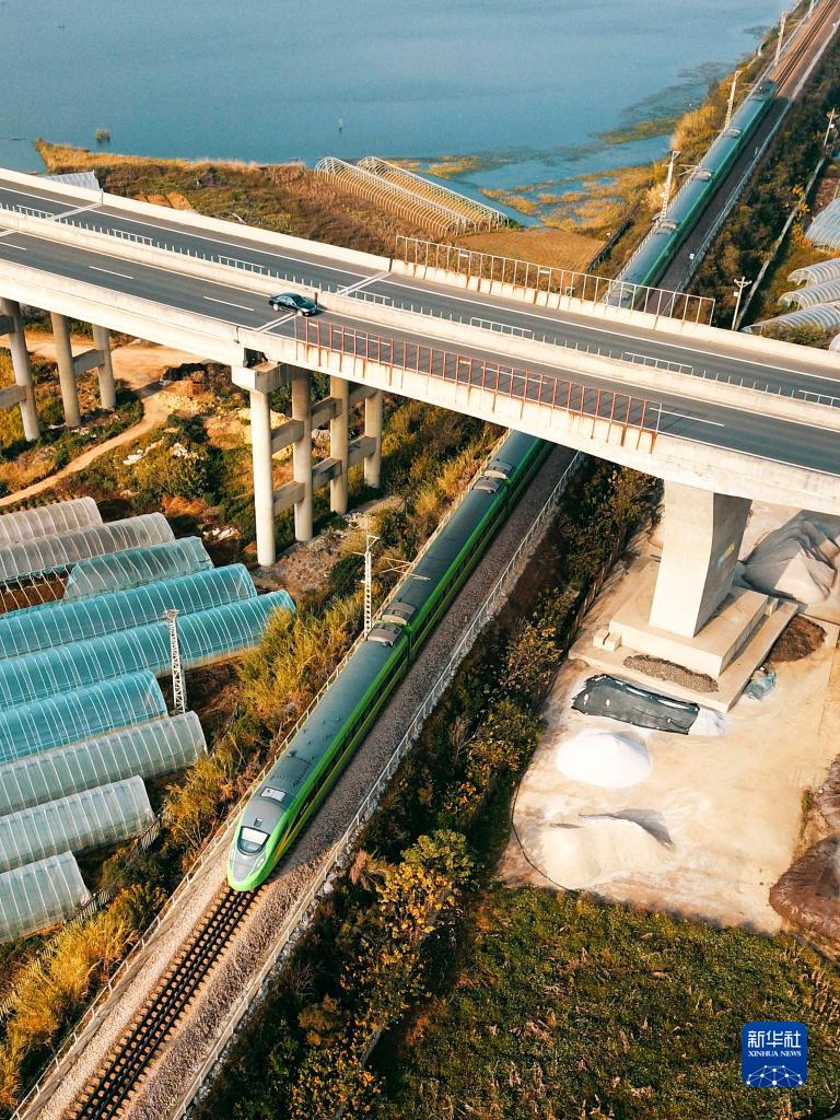 1月9日,動車組列車行駛在云南省紅河哈尼族彝族自治州個舊市境內(nèi)(無人機(jī)照片)。