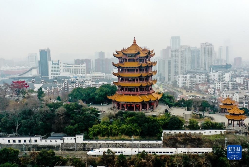 1月9日,一趟動車組列車經(jīng)過武漢黃鶴樓景區(qū)(無人機(jī)照片)?! ?/p>