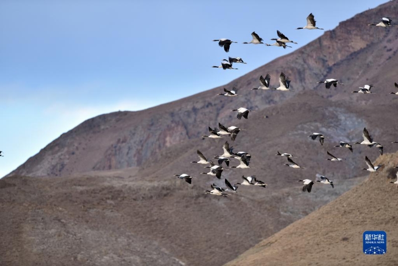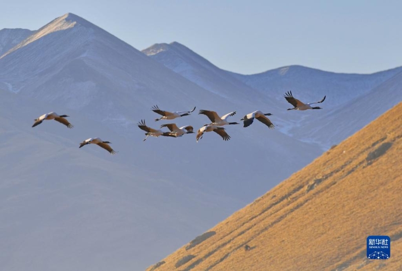 黑頸鶴在拉薩市林周縣上空飛翔(1月9日攝)。