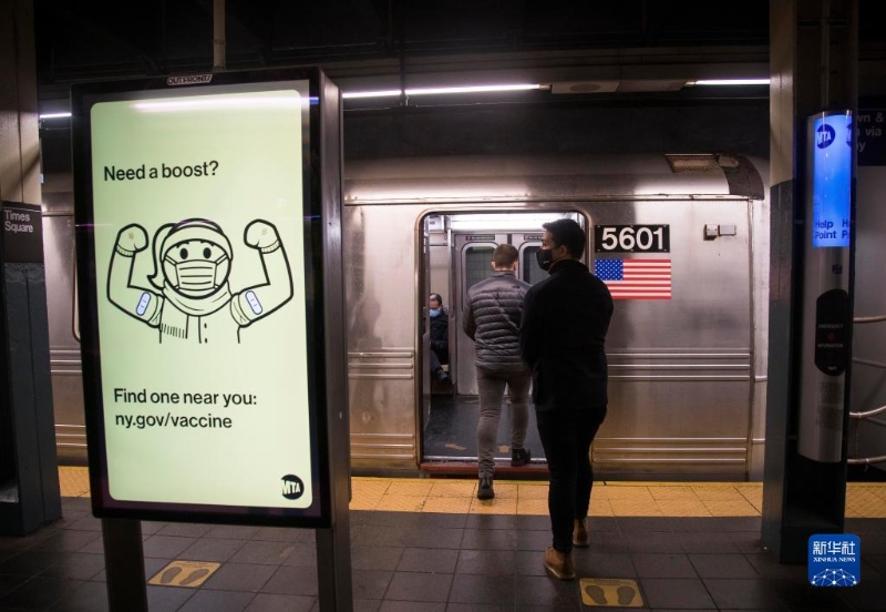 這是1月9日在美國紐約一處地鐵站內拍攝的新冠疫苗加強針廣告。