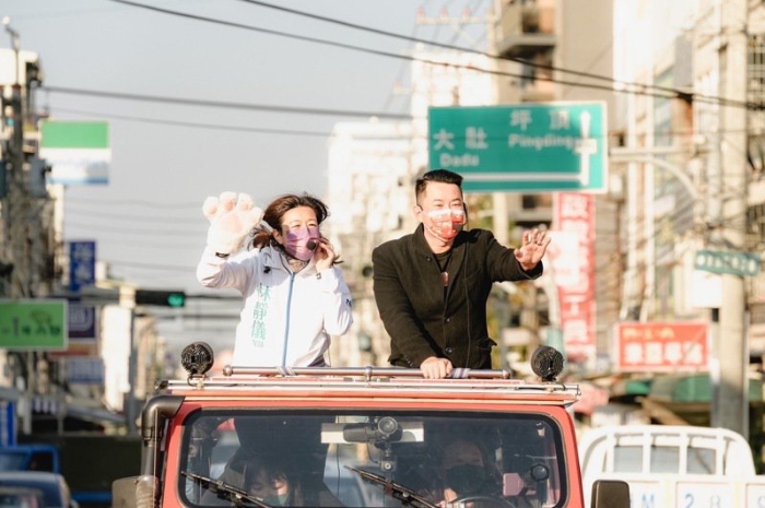在臺中市第二選區(qū)“立委”補選獲勝的林靜儀(左),由前“立委”陳柏惟陪同展開謝票行程。圖/林靜儀競選總部提供