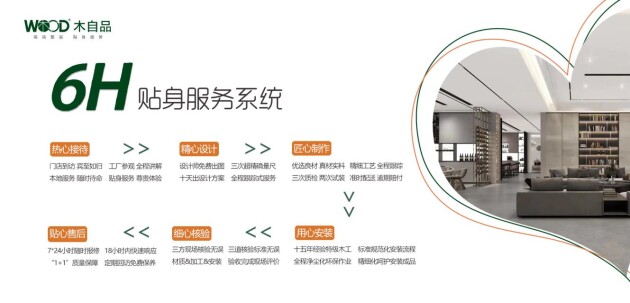 所謂6H,H即Heart(心)的英文首字母;6H即六重“心”服務(wù)——熱心接待、精心設(shè)計(jì)、匠心制作、用心安裝、細(xì)心核驗(yàn)與貼心售后。木自品+,以真誠(chéng)的心作為全程貼身服務(wù)的最高標(biāo)準(zhǔn),以提供高品質(zhì)整裝產(chǎn)品為核心,以“提供超出用戶期待的高品質(zhì)產(chǎn)品與服務(wù)”為服務(wù)理念,用專業(yè)化、標(biāo)準(zhǔn)化、系統(tǒng)化、人性化的定制全服務(wù)鏈,為消費(fèi)者交付一個(gè)幸福美滿的理想家居空間。