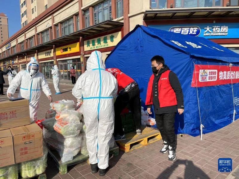天津市津南區(qū)物美超市工作人員準(zhǔn)備為封控區(qū)、管控區(qū)內(nèi)的居民運(yùn)送生活物資(資料照片)。新華社發(fā)