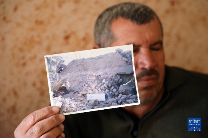 1月4日,在伊拉克薩拉赫丁省,易卜拉欣展示自家房屋被炸毀的照片。