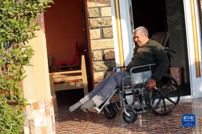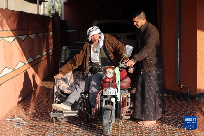 1月4日,在伊拉克薩拉赫丁省,易卜拉欣坐在輪椅上。