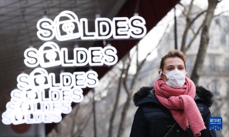 1月12日,一名女子走過法國巴黎街頭的打折季廣告。