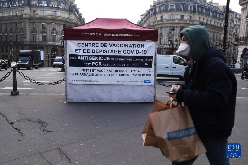 1月12日,一名男子拎著購物袋走過法國巴黎街頭一處新冠病毒檢測點。