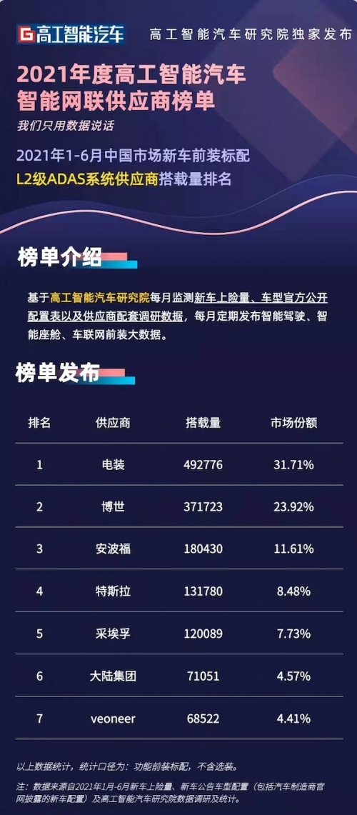 另據(jù)高工智能汽車研究院監(jiān)測數(shù)據(jù)顯示,2021年1月-6月中國市場新車前裝標配L2級ADAS系統(tǒng)供應(yīng)商搭載量排名中,電裝以492,776臺的搭載量、31.71%的市場份額排名榜首。