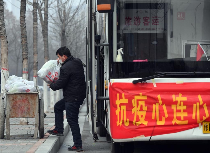 1月10日,在河南省禹州市寨子社區(qū),工作人員將蔬菜包卸車。新華社記者 李嘉南 攝