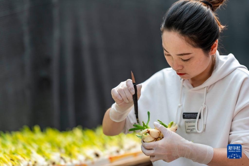 1月16日,在漳州市高新區(qū)九湖鎮(zhèn)百花村,一名水仙花批發(fā)店店主在給水仙花球削葉片。
