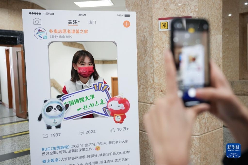 1月15日,來自中國傳媒大學(xué)的志愿者蔡云詠在場館培訓(xùn)營開班儀式后與宣傳板合影留念。