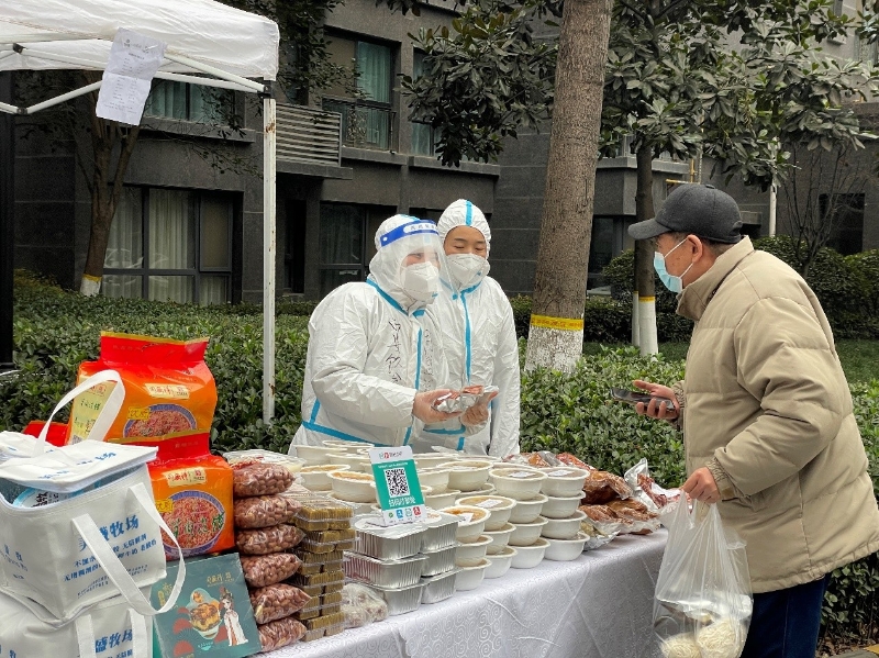 第二天,“班長”又給每一戶通過微信通知,樓下扎起了兩個便民購物點,有米面油、果蔬,西安飯莊、大中華、老孫家等老字號的蒸碗、燒雞、香腸、臘肉、花卷、饅頭、八寶菜、臘牛羊肉、羊肉泡等熟食套餐,需要的人就悄沒聲兒地下樓去。