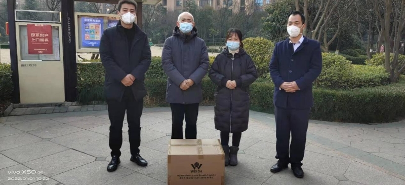 (曲江觀邸業(yè)主為了表達(dá)感謝,給物業(yè)工作人員送來了一箱口罩。左三為王櫻)