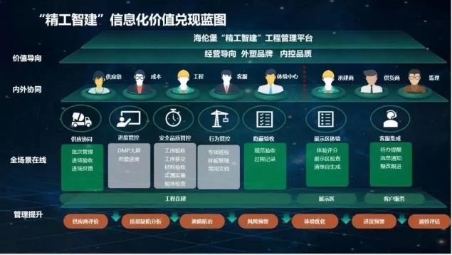 為了打磨更精細(xì)的產(chǎn)品,海倫堡嘗試將數(shù)字化運(yùn)用到工程項(xiàng)目中,“精工智建”是海倫堡研發(fā)出來(lái)的一款數(shù)字產(chǎn)品,也是展現(xiàn)海倫堡工程品質(zhì)力的IP品牌。“精工智建”以經(jīng)營(yíng)賦能、外塑品牌、內(nèi)控品質(zhì)為價(jià)值導(dǎo)向,基于內(nèi)外協(xié)同、全場(chǎng)景在線、管理提升的目標(biāo),聚焦工程管理標(biāo)準(zhǔn)切實(shí)落地,并通過(guò)項(xiàng)目看板、報(bào)表中心、材料管理、工序驗(yàn)收、樣板管理等系統(tǒng)功能將核心管控場(chǎng)景的業(yè)務(wù)流程實(shí)現(xiàn)全面上線?!熬ぶ墙ā甭涞匾院螅欣诤惐そㄖa(chǎn)品的管理,讓海倫堡能更加嚴(yán)格把控品質(zhì)輸出。