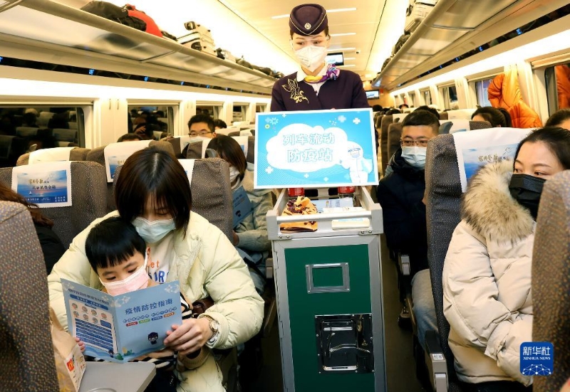 1月16日,乘務(wù)員在上海虹橋開往漢口的G1724次列車上向旅客分發(fā)防疫宣傳冊。新華社記者 陳飛 攝