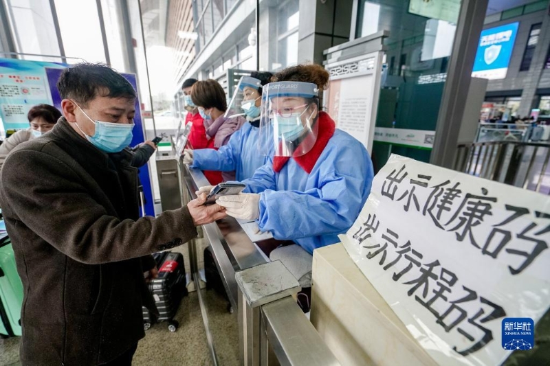 1月17日,在浙江省湖州市長興站進(jìn)站口,防疫工作人員和轄區(qū)志愿者查驗進(jìn)站旅客健康碼、行程碼。新華社發(fā)(吳拯攝)