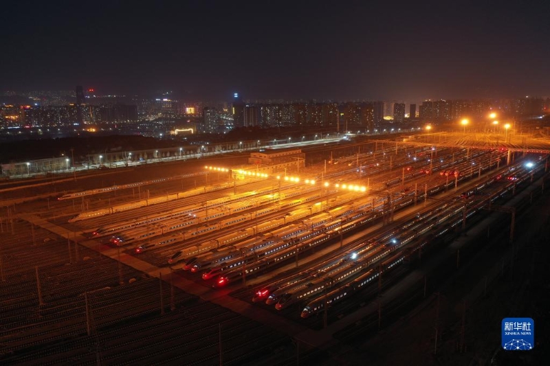1月16日晚,動車組列車??吭谥袊F路蘭州局集團有限公司蘭州車輛段蘭州西動車運用所整備場上,為1月17日開始的2022年春運做好準(zhǔn)備(無人機照片)。新華社記者 杜哲宇 攝