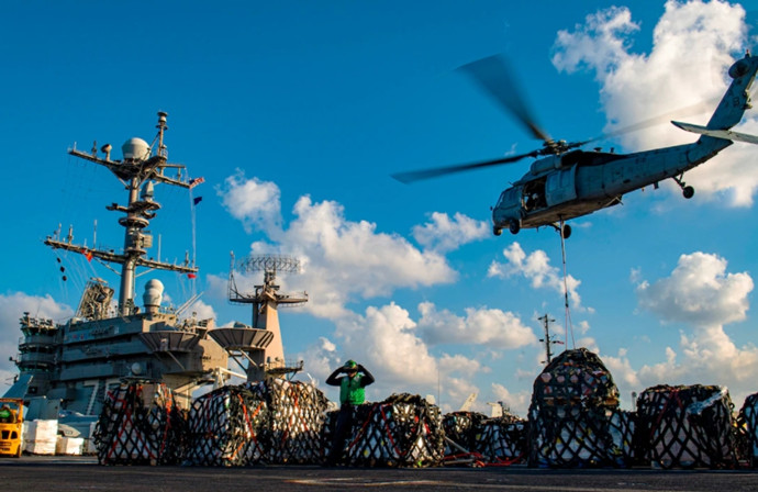 美軍向正在地中海的杜魯門號航母運送補給物資 五角大樓圖