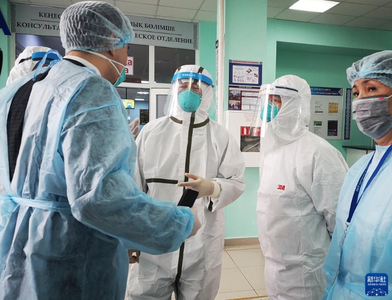 2020年4月14日,在哈薩克斯坦努爾蘇丹第九綜合醫(yī)院,中國(guó)援哈醫(yī)療隊(duì)成員與哈薩克斯坦醫(yī)護(hù)人員交流如何優(yōu)化醫(yī)院管理減少院內(nèi)感染。新華社發(fā)(哈薩克斯坦實(shí)業(yè)報(bào)供圖)